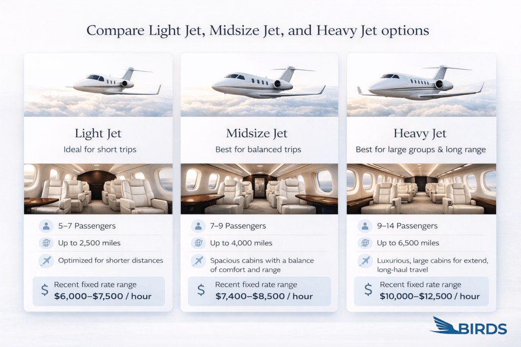 BIRDS uses a fixed-rate pricing model designed to make private jet booking more clear and predictable. Rather than navigating inconsistent pricing and back-and-forth negotiations, users can book based on a set hourly structure tied to aircraft cabin size, making it easier to understand how pricing works before confirming a trip. This creates a more streamlined and transparent booking experience while still allowing trip details, routing, and operational factors to be accounted for.